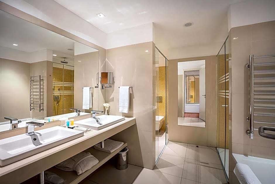 Large suite featuring separate living/sleeping areas, elegant dining area, and private spa bath.